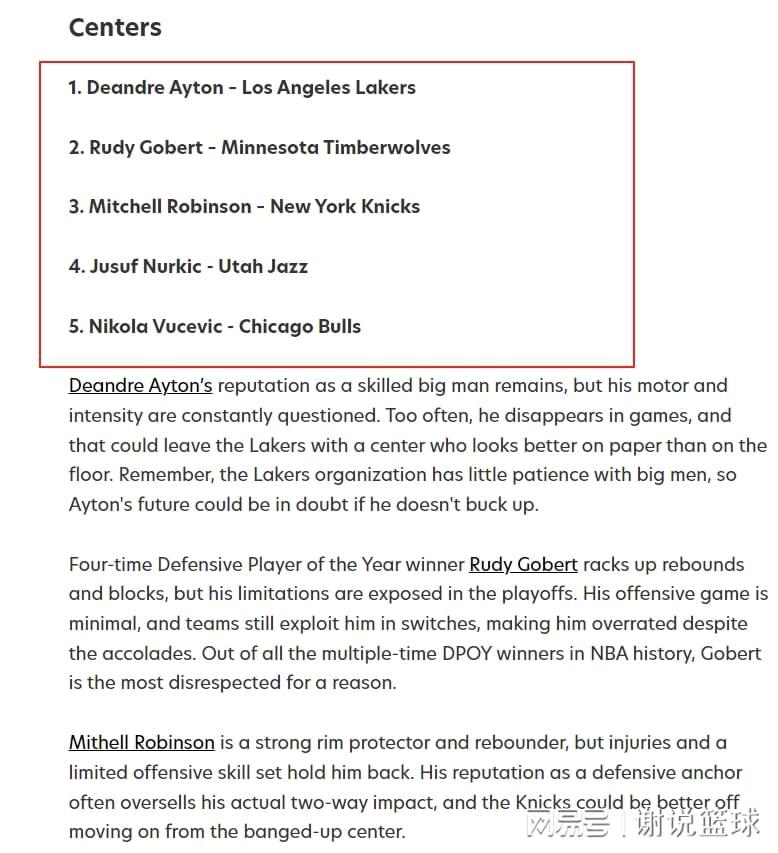 那么在当今联盟,现役最被高估的五名中锋方面,当地媒体也有自己观点。其中湖人前状元艾顿领衔,三名欧洲内线戈贝尔、努尔基奇和武切维奇上榜,还有一位球员是尼克斯中锋米切尔-罗宾逊